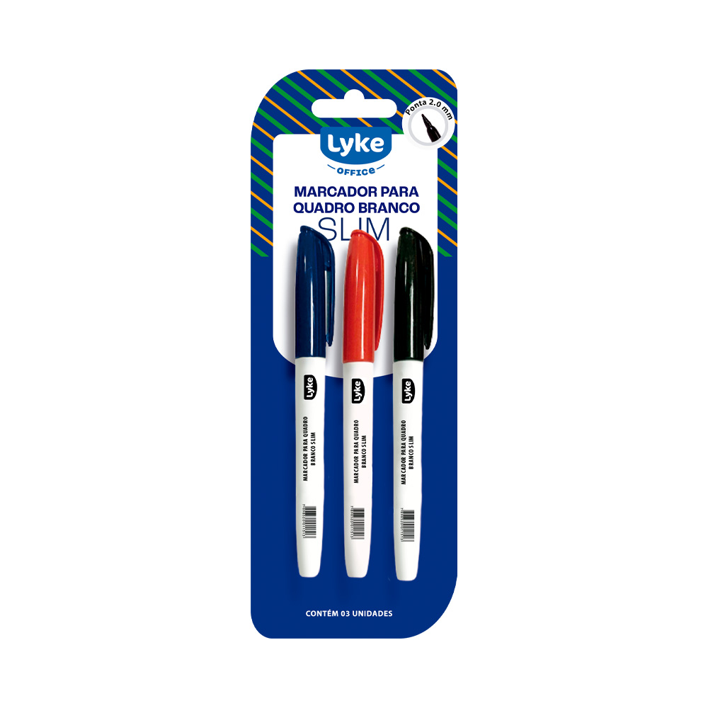 Marcador para Quadro Branco Slim, com 3 cores, possui sua ponta redonda que proporciona melhores traços e visibilidade quando utilizado em grandes espaços. É ideal para uso didático e apresentações.